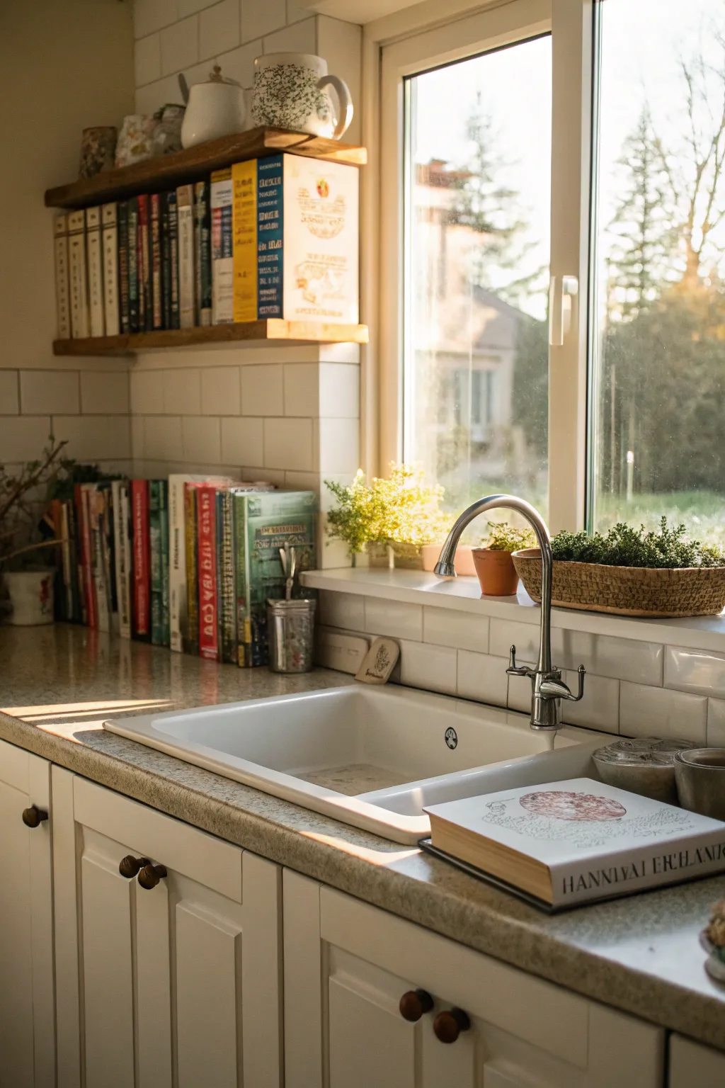 Utilize the space above your sink to exhibit a few cookbooks for easy access and inspiration. It’s a practical choice that I find visually appealing.