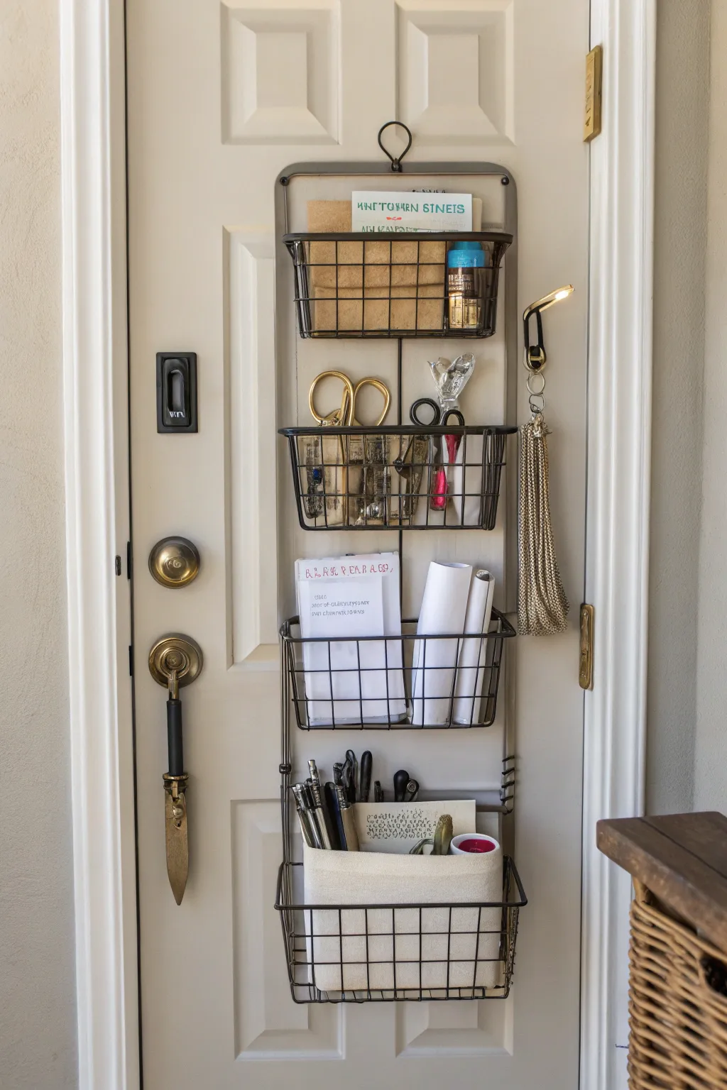 A basket-style door mount brings practical, adaptable storage to any room, ideal for everything from cleaning products to kitchen necessities.