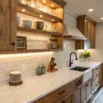 Incorporating rural details such as raw wood ledges paired with your backsplash establishes an intimate, welcoming ambiance. I’m captivated by how this aesthetic introduces coziness and appeal to a culinary space.