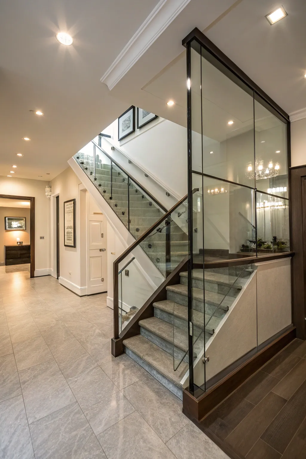 Incorporate crystal panels for an open, airy sensation that doesn’t forfeit protection. I often employ crystal to sustain openness while ensuring the stairwell feels integral to the entire abode.