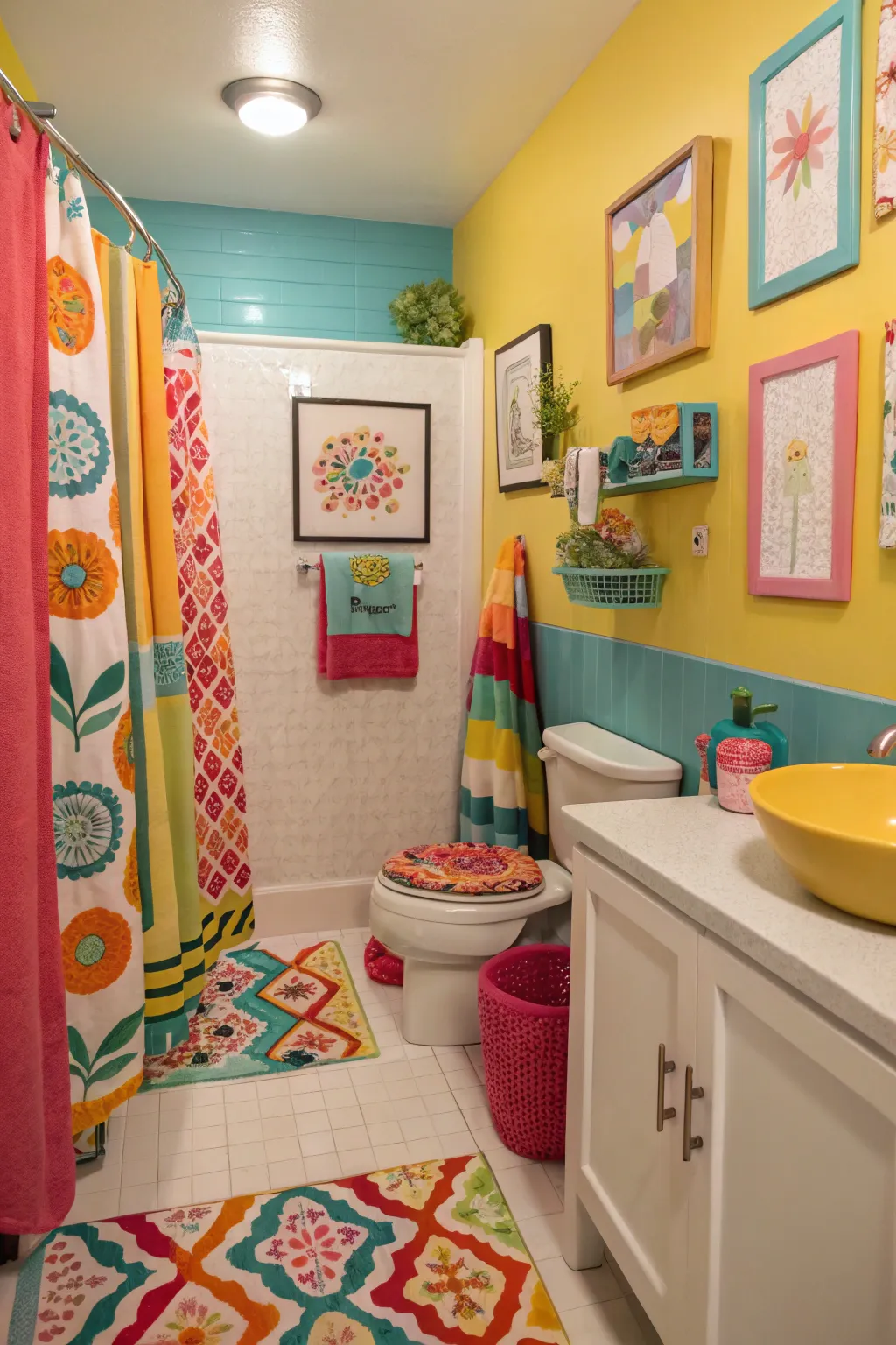 - Vibrant bath mat with quirky patterns: Incorporate a splash of color with a quirky bath mat that complements your playful restroom theme.