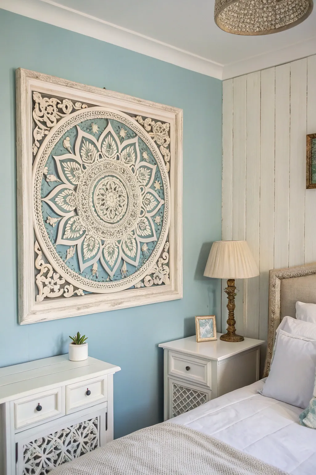 Incorporate ornamental wall decor to enrich the visual charm of your bedroom. I’ve discovered that pieces featuring azure and pristine themes can flawlessly unify the entire room.