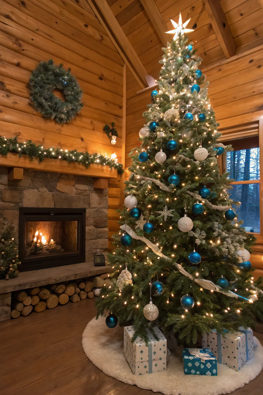 Unite blue with rustic white components like wooden ornaments for a grounded, charming visual. It’s perfect for a cozy cabin vibe.