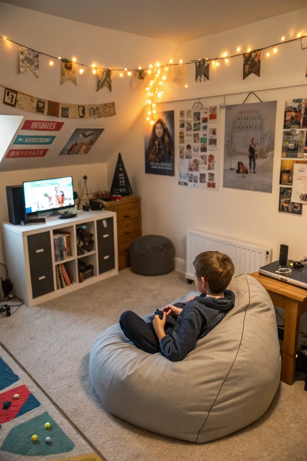 Establish a designated gaming or leisure zone with comfortable seating or floor cushions. My nephew’s cherished spot is his comfortable seating corner where he unwinds playing games.