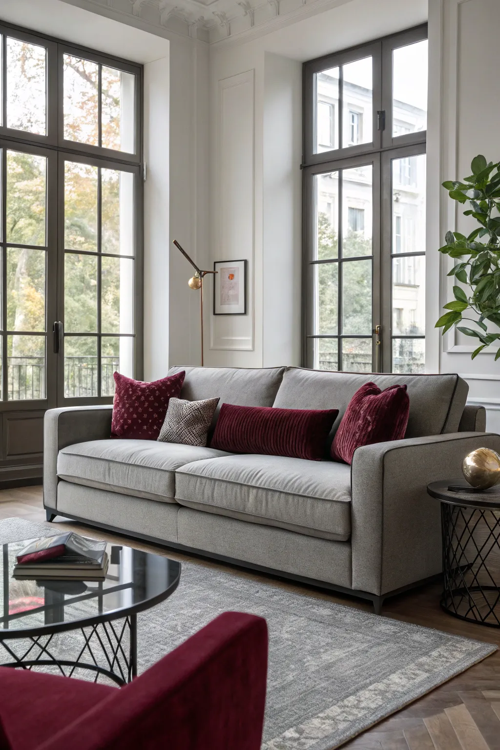 Unite a polished grey sofa with opulent deep red pillows for a welcoming, snug presentation. I favor this arrangement, as it effortlessly combines comfort and style. The comparison between understated grey and active deep red generates a balanced, pleasing design ideal for the contemporary lounge.