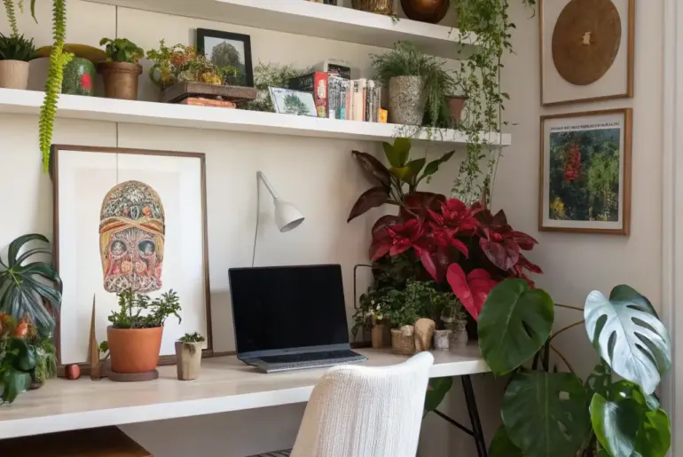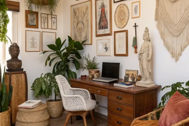 Designing a boho office is more than just about surface-level appeal; it’s about shaping a space that sparks creativity and peace. Let’s explore how to turn your work area into a bohemian sanctuary. Focus on Illumination Natural and pendant lighting craft a warm, inviting office area. Maximize natural light whenever possible, complemented by pendant lights for a cozy radiance. I feel this pairing creates an inviting mood. Items that may come in handy: Wicker Pendant…