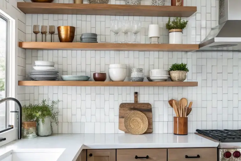 Floating kitchen shelves are the LBD of interior design—they’re flexible, chic, and oh-so functional. If you’re hoping to amplify your space or put your treasured items on display, I have some incredible concepts to explore. Stacked Open Shelving Stacked boards for added dimension. Stacking boards vertically can build depth and dimension. I have three stacked boards that not only offer ample storage but also draw the eye upward. Might be a good match: Hanging Timber…