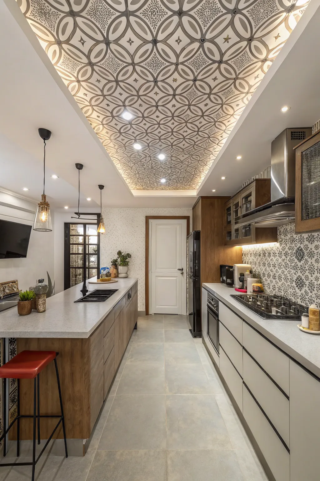 Leveraging patterns on your overhead can conjure optical tricks that render the space more expansive or dynamic. It’s a whimsical approach to inject intrigue.