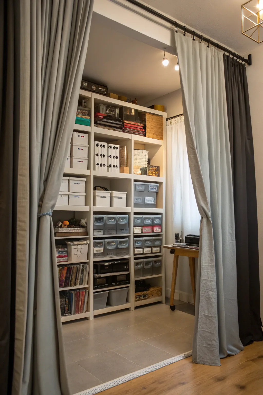 Merge curtains with shelving for an efficient and stylish solution. In my studio, I utilize curtains to conceal organized shelves, maintaining a clutter-free yet fashionable space that inspires productivity.