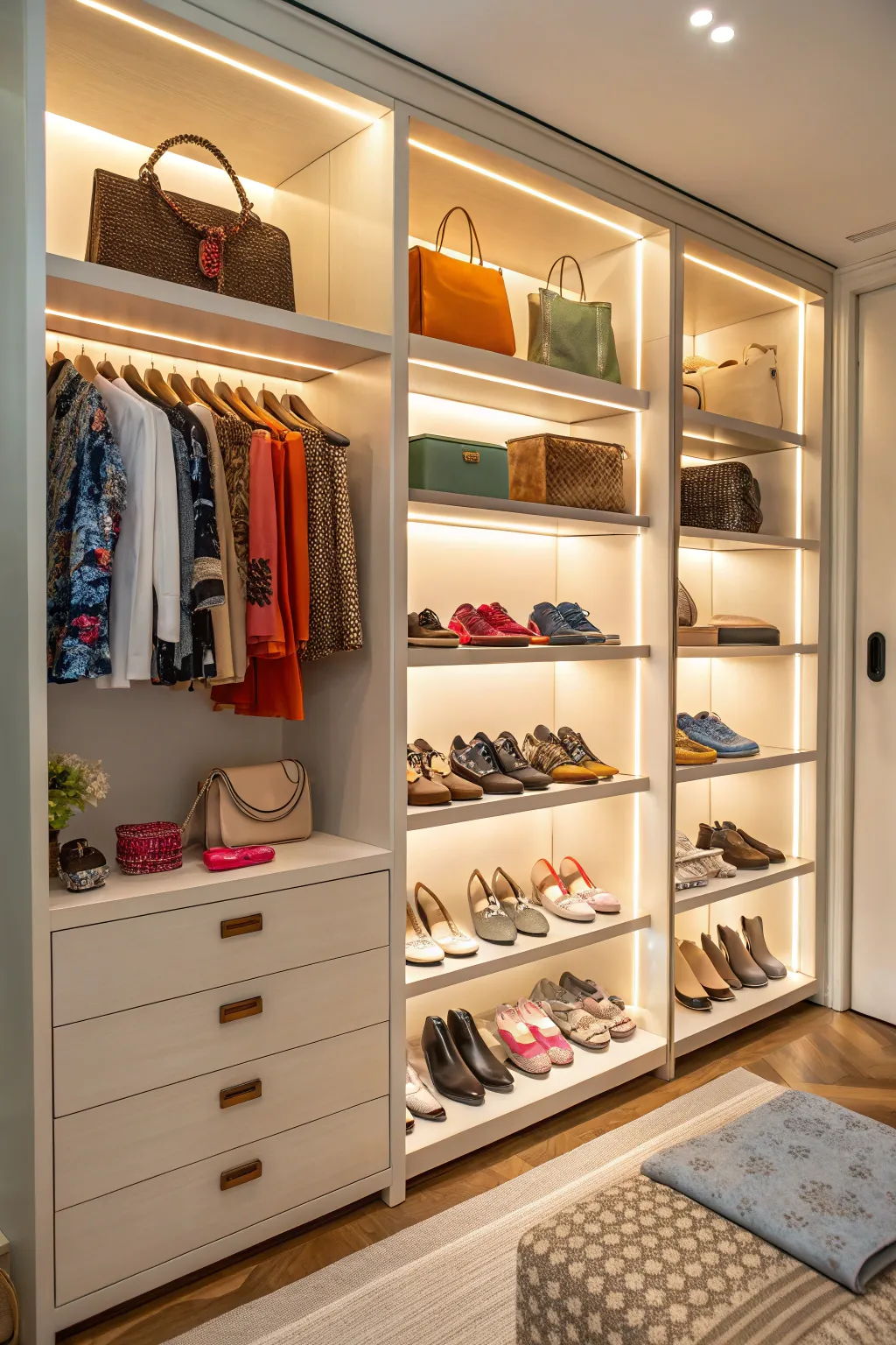 • Illuminated Strips: Enhance your display shelving with luminous strips, adding both clarity and atmosphere to your closet.
