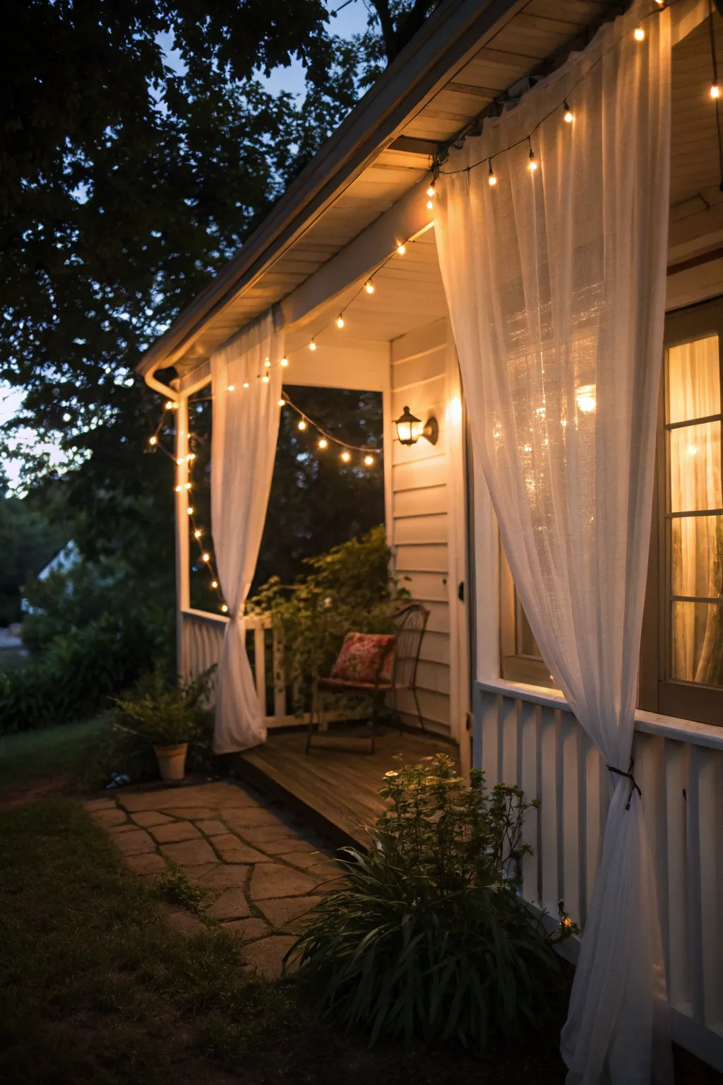 Combine fairy lights with sheer shades for a magical evening ambiance. This enchanting combination transforms your porch into a whimsical retreat.