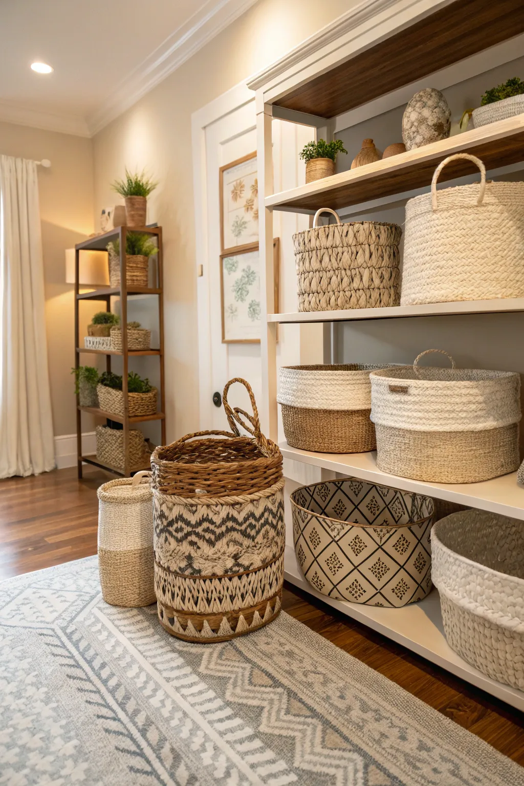Opt for creative keeping solutions like decorative totes. They keep your space tidy while injecting a stylish touch.