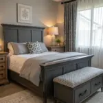 Add practicality with a charcoal-toned enclosure that doubles as storage or seating. I’ve utilized space-saving benches along my screen for both seating and storage.