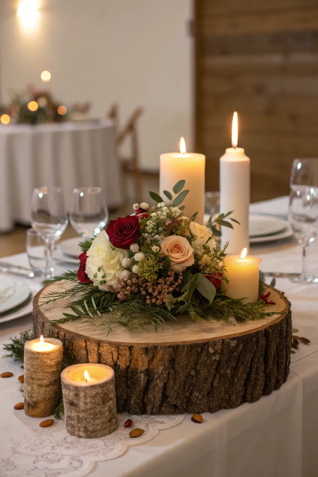 Fashion an awe-inspiring woodland table centerpiece for your dining setup by adorning a refined lumber cut with ambient candles and blossoms. It never fails to capture attention during my hosted dinners.
