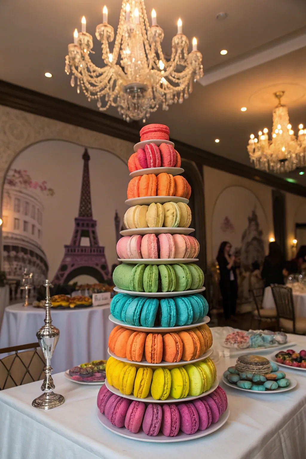 Construct a stylish almond meringue display for a chic and vibrant effect. For a Parisian-themed celebration, this became a refined center of attention.