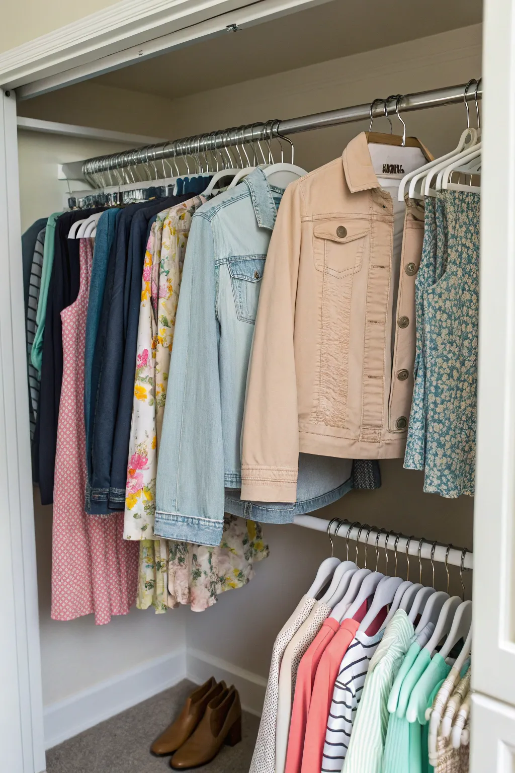 Use the double rails for seasonal rotation, keeping in-season clothes accessible while storing others above. This method ensures my wardrobe stays relevant and clutter-free.