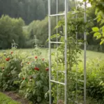 Painted supports can support climbing plants and add a pop of color. Mine are a bright blue, and they really stand out against the greenery.