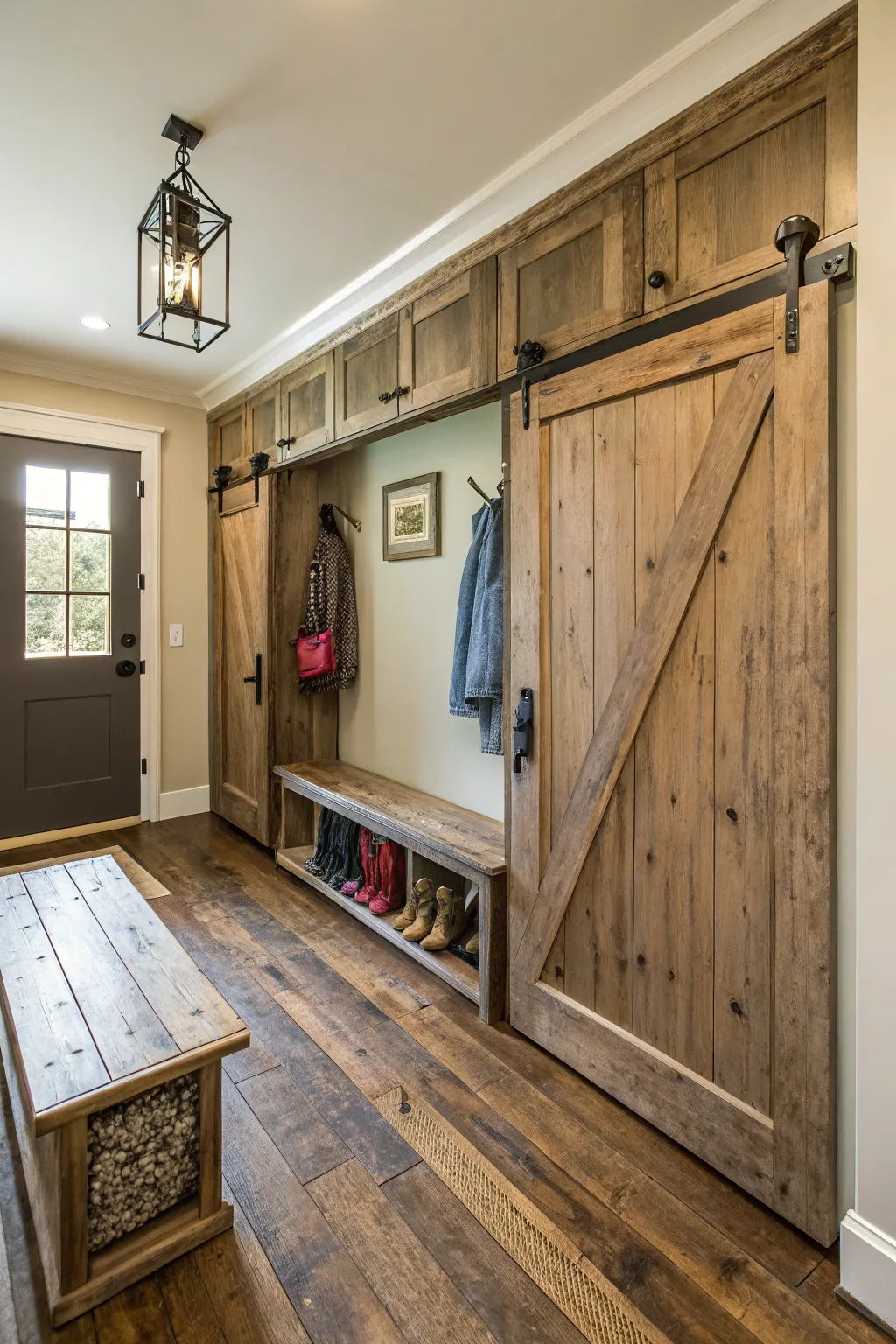 - Rustic Sliding Barn Door Set: Boost your mudroom’s charm by adding an easy-mount sliding barn door set.