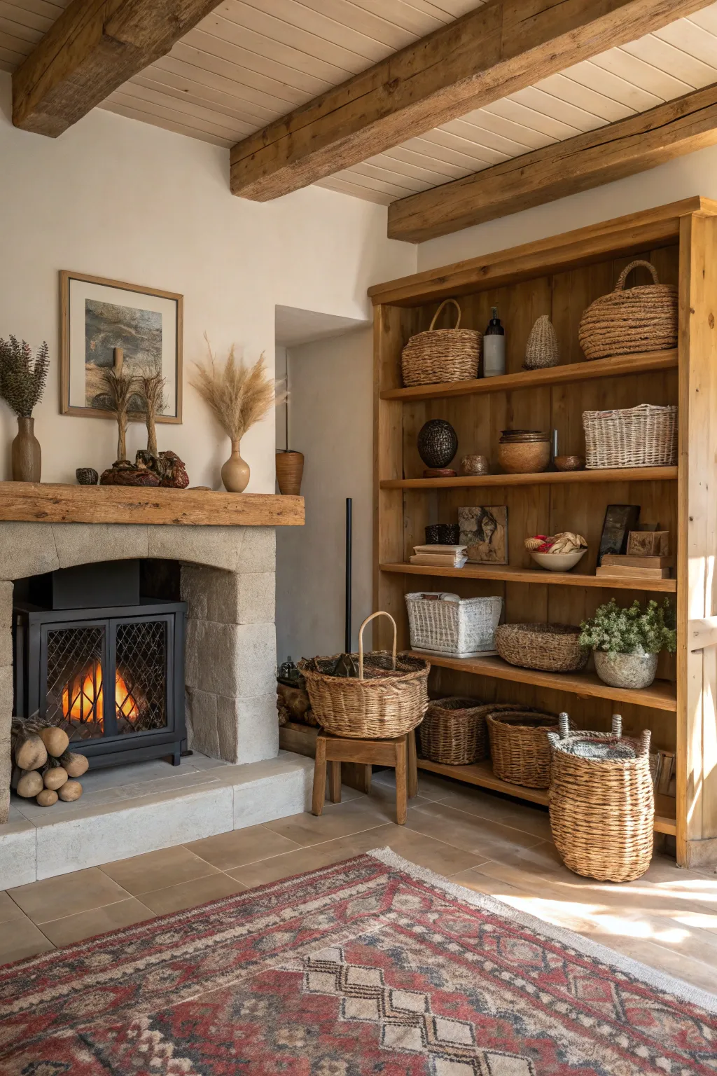 Capture a country farmhouse atmosphere using wooden shelves adorned with woven containers and earthen flower holders. This design choice brings coziness and rural beauty into your home.