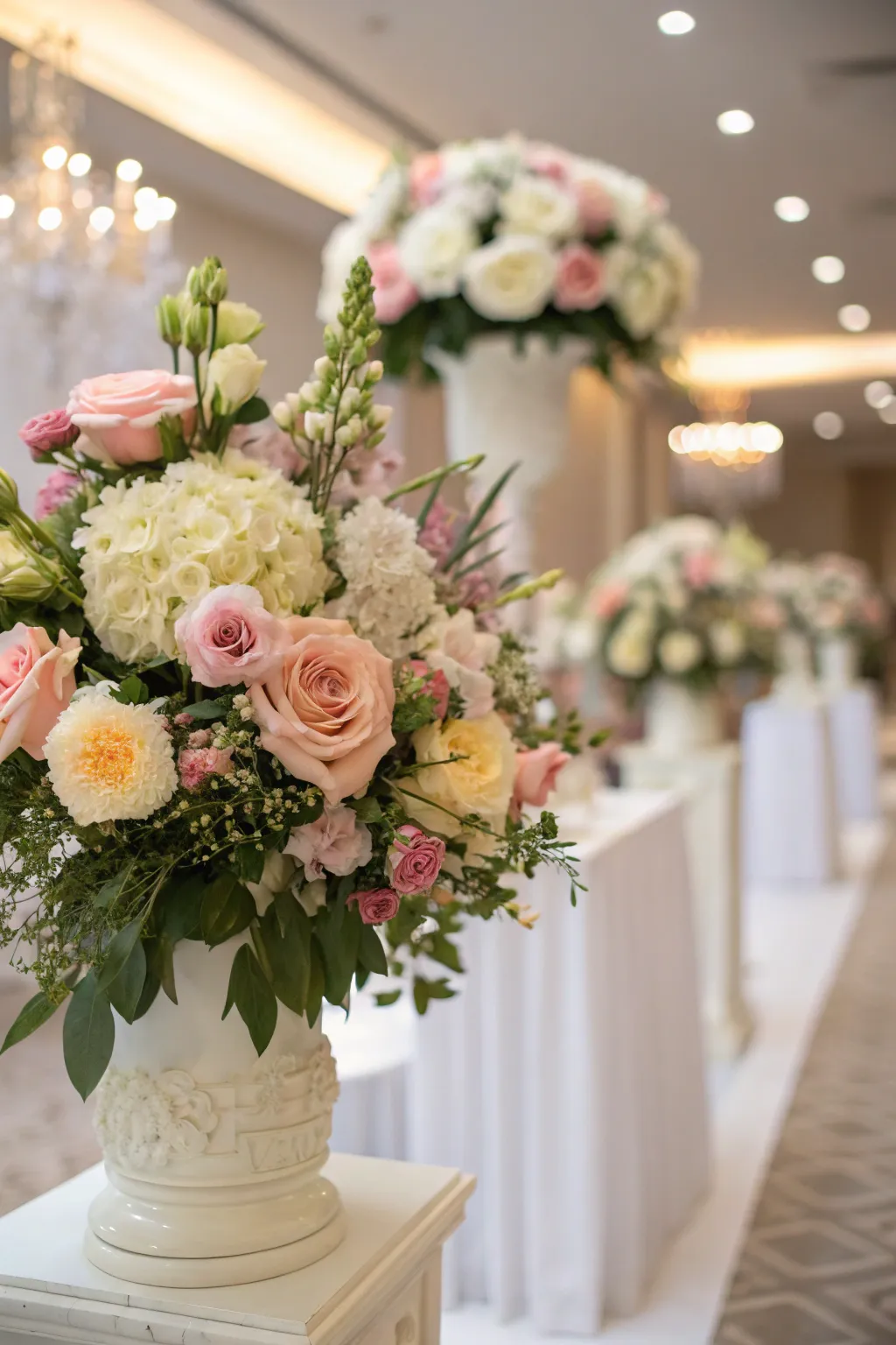 Bring grandeur to your décor with tall arrangements that add both drama and height to your venue. I find these towering designs truly transform spaces, lending an air of opulence.