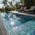 Elevate the contemporary tropical ambiance by selecting palms that enhance your home’s structural design. In my designs, merging modern aspects with tropical flora yields a captivating beauty.