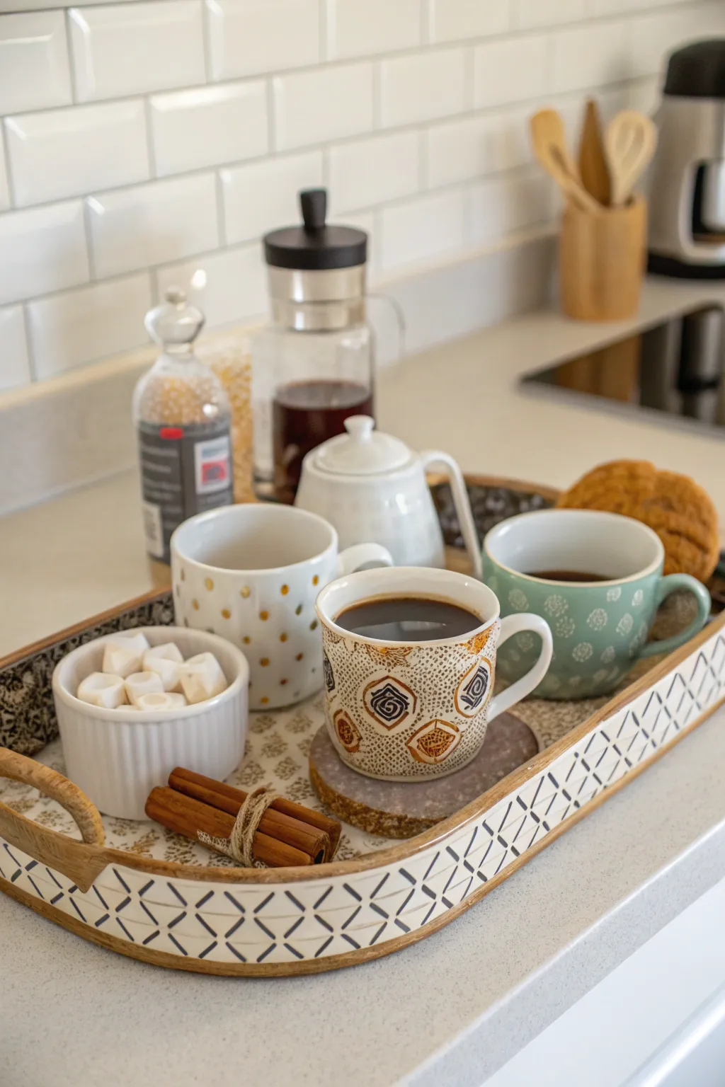 An ornamental coffee platform is both practical and beautiful for displaying and serving. I often use these to stylishly organize mugs and accessories.