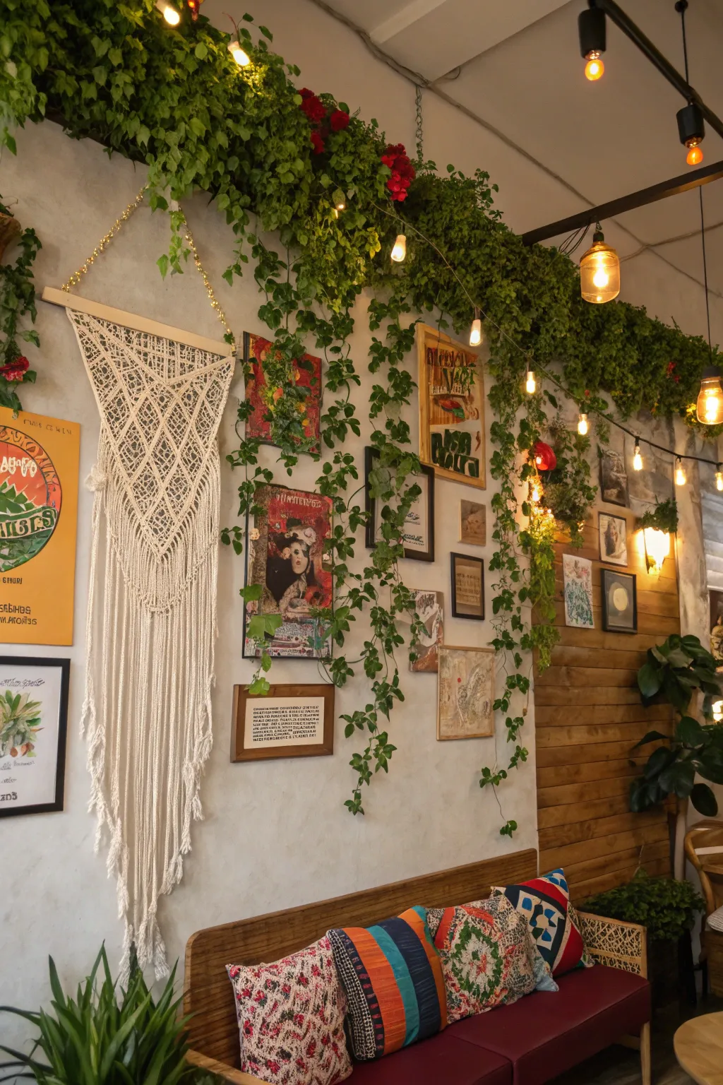 A bohemian greenery wall with diverse decorations generating an artistic and inviting vibe.