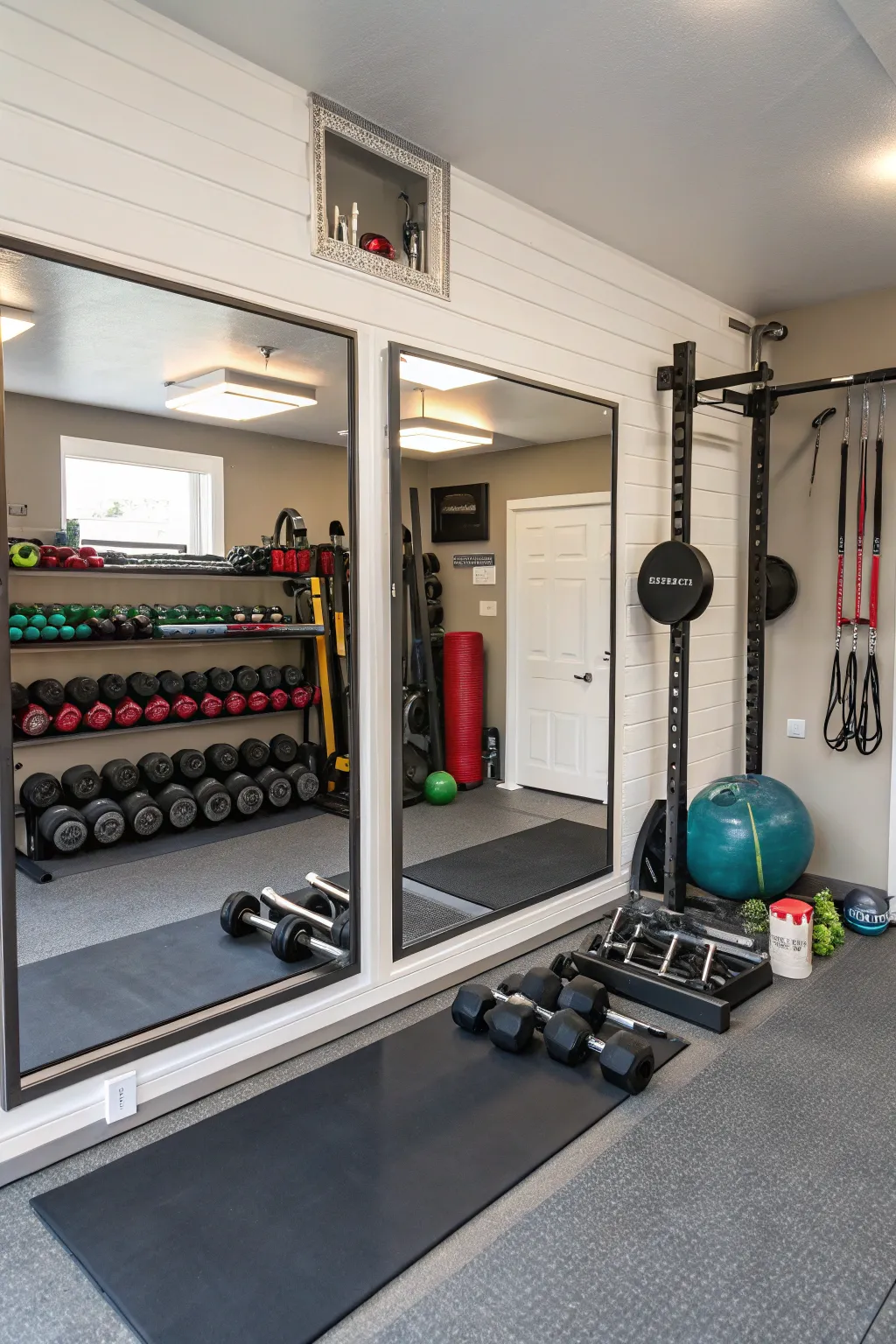 Utilize mirrors to demarcate distinct workout zones within your home gym. This helps organize the space, especially if shared, by clearly defining areas for various activities.