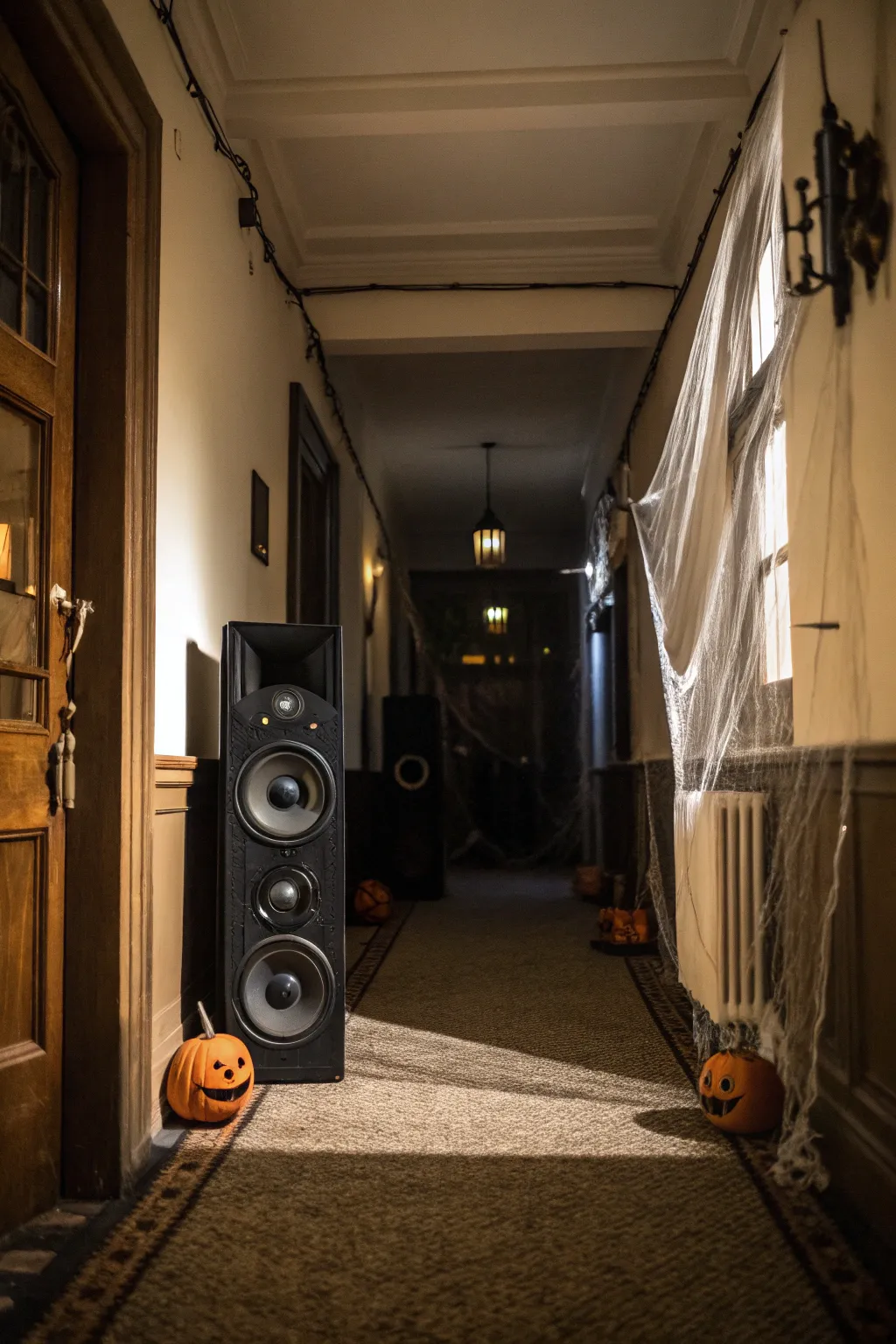 Perform eerie soundtracks or ambient sounds to evoke the spirit of Halloween. I frequently employ concealed speakers to sustain guests’ wonderment regarding the sounds’ provenance.