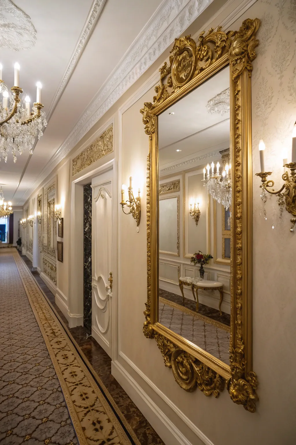 Full-length mirrors enhance the sense of space and light, adding grandeur.