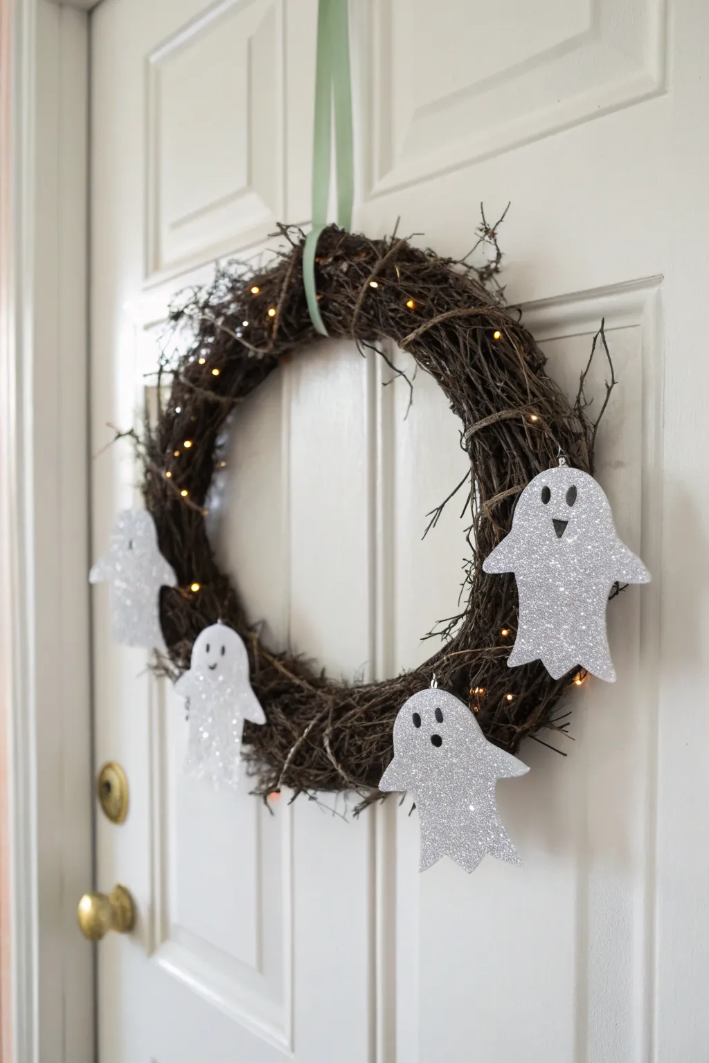 Fashion a garland of petite glimmer-coated phantoms to drape encircling your wreath. It’s a sparkling means to seize the essence of Halloween.