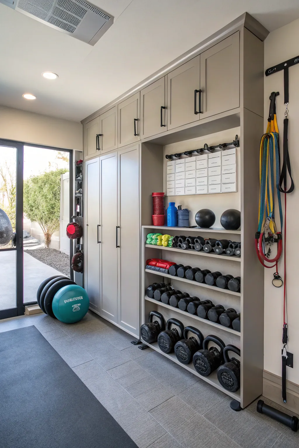 Use sliding panels to conceal equipment when not in use. In my small gym, they support maintaining a clean aesthetic without sacrificing storage capacity.
