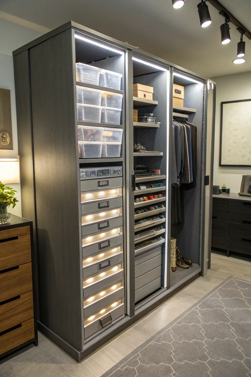 Custom shelves and racks inside slim cabinets can significantly increase your storage capacity. This method is perfect for organizing multiple layers of items, keeping them easy to reach.