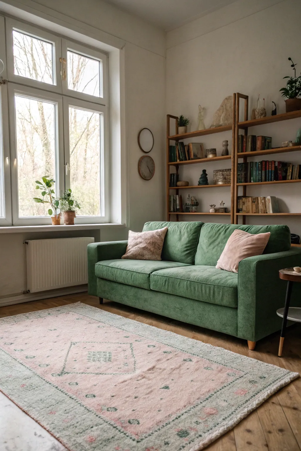 A delicate hued floor covering can soften the impression of an audacious emerald sofa, establishing a serene and calming atmosphere. This combo functions admirably in areas aspiring for a gentle, inviting sensation.