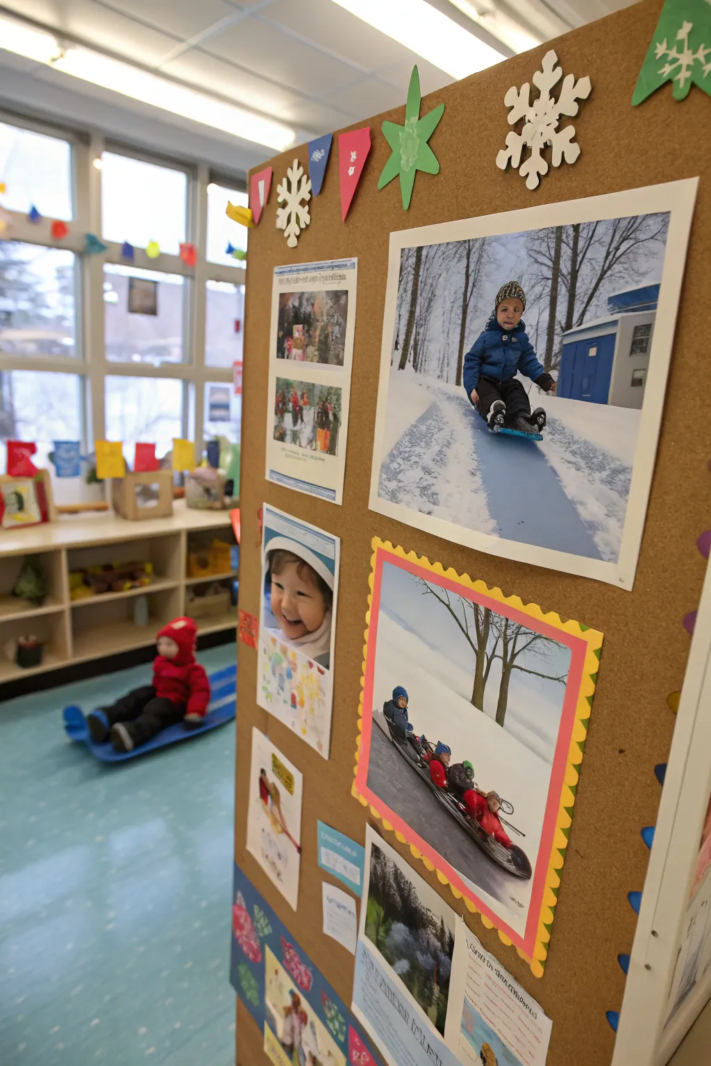 Encapsulate the delight of winter with sleds and children metaphorically ‘gliding’ into the season. This vibrant showcase can feature the children’s drawings or memorable photos.