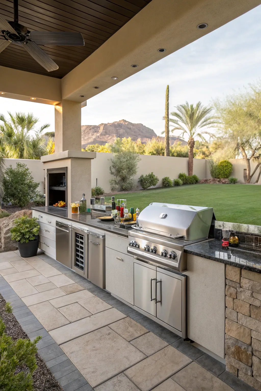 Adopting stone and brick details within your outdoor culinary space not only elevates its resilience but also introduces a countryside allure that harmonizes beautifully with Arizona’s innate scenery. Trust me, the feel and genuine shades of stone craft an inviting and welcoming vibe.