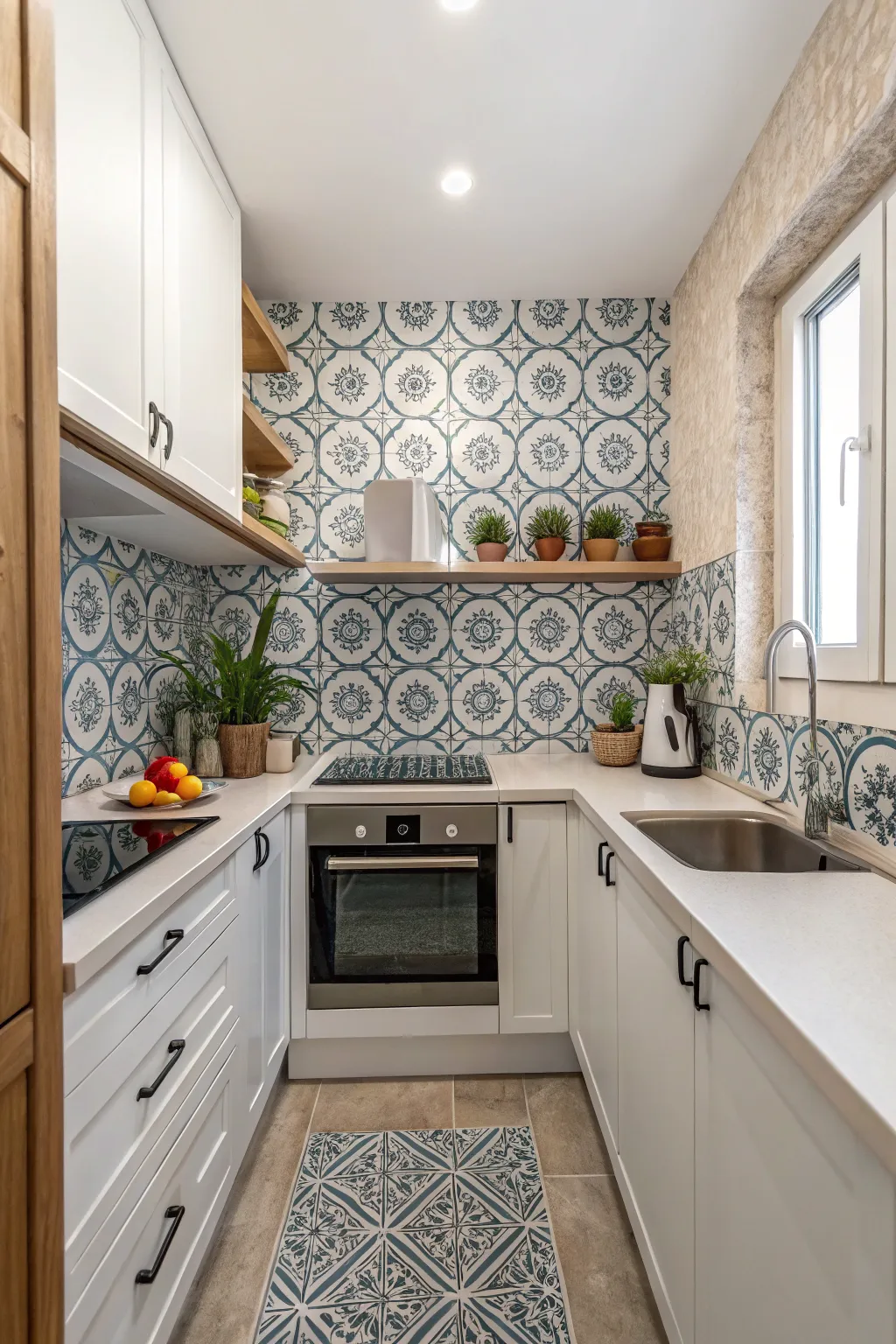 A distinct backsplash acts as an elegant focal element within a compact kitchen.