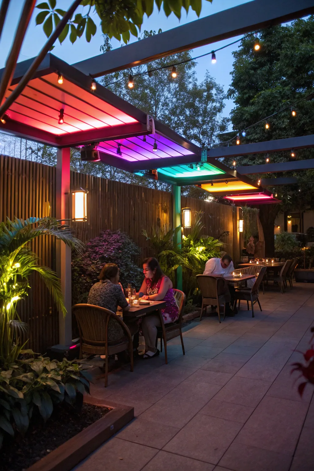 Employ concealed radiance bands to foster a refined and modern aesthetic. I admire how they delicately accentuate borders and steps on my patio.