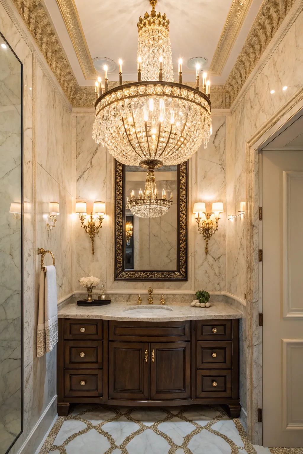 • Gilded Wall Sconces: Illuminate your washroom with elegant gilded wall sconces for a touch of glamour.