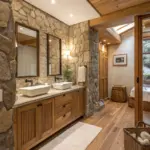 Bathroom featuring organic accents like wood and greenery.
