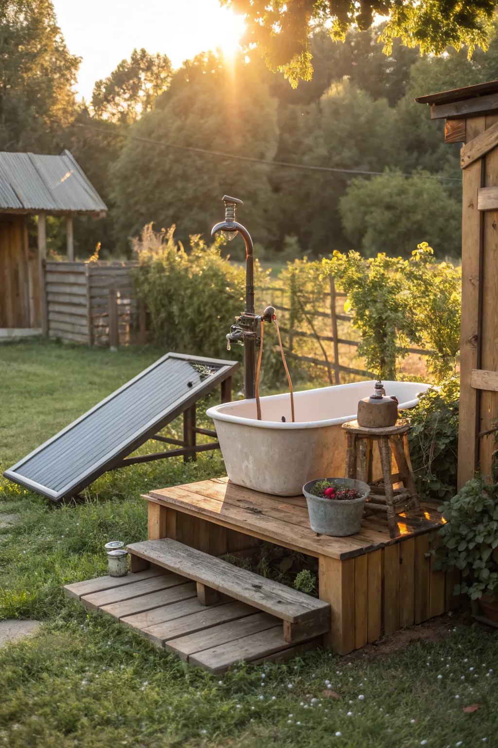 Upgrade your dog's bath time with solar-heated comfort in a rustic backyard oasis.