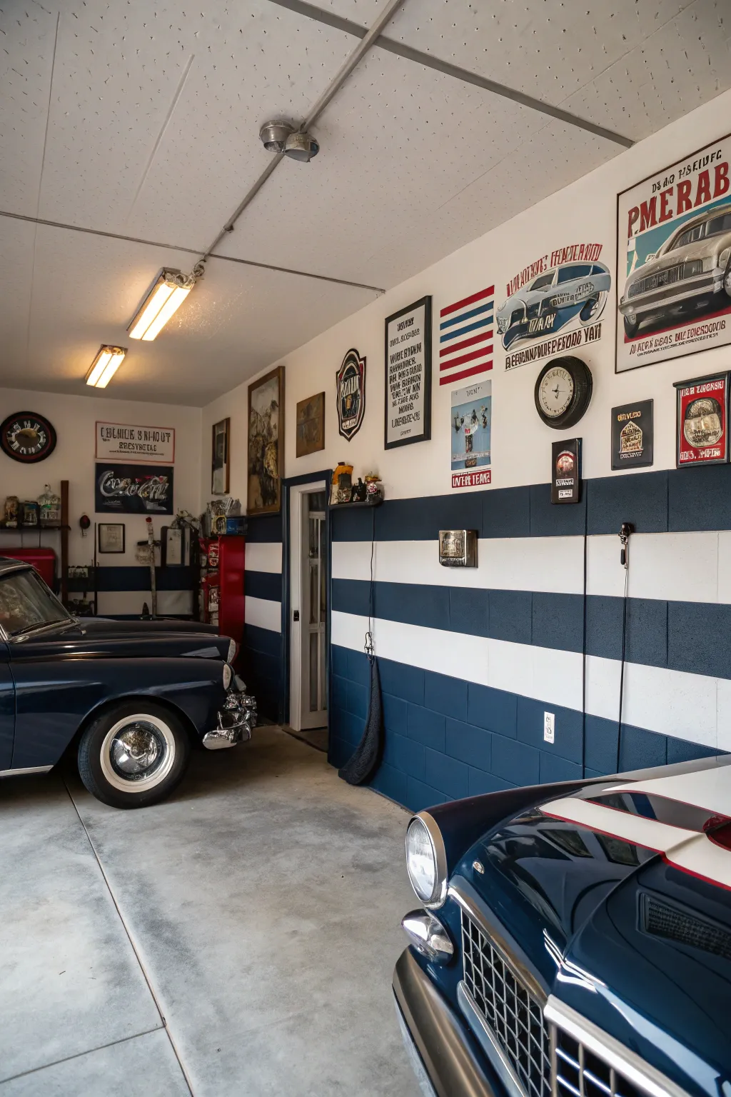 - Azure and Bleached White Striped Wall Finish: For a calming nautical atmosphere, transform your garage with tranquil azure and bleached white stripes.
