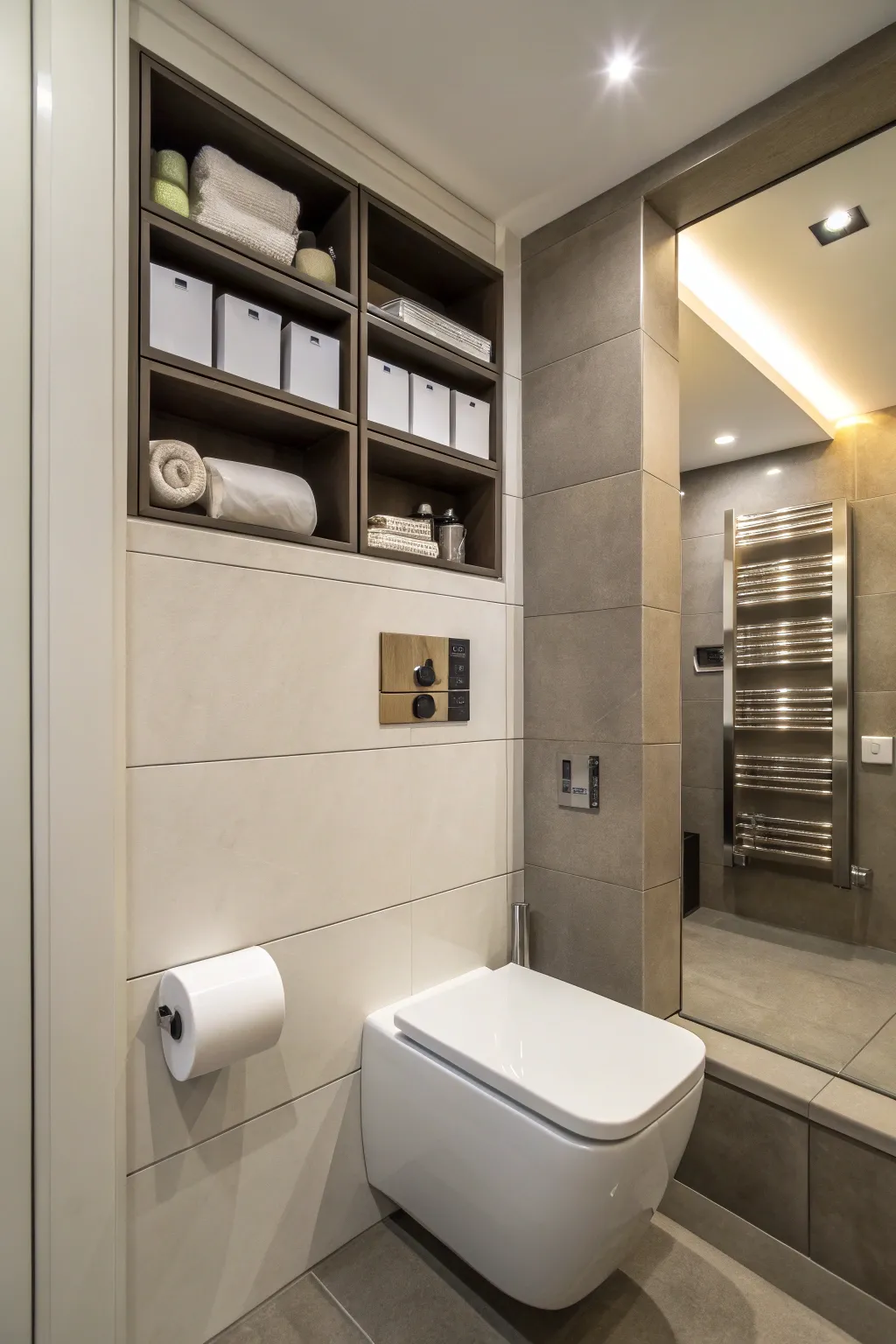 Incorporate built-in shelving above the commode for easy access. This is my preferred solution for clients wanting a seamless integration with their existing bathroom layout.