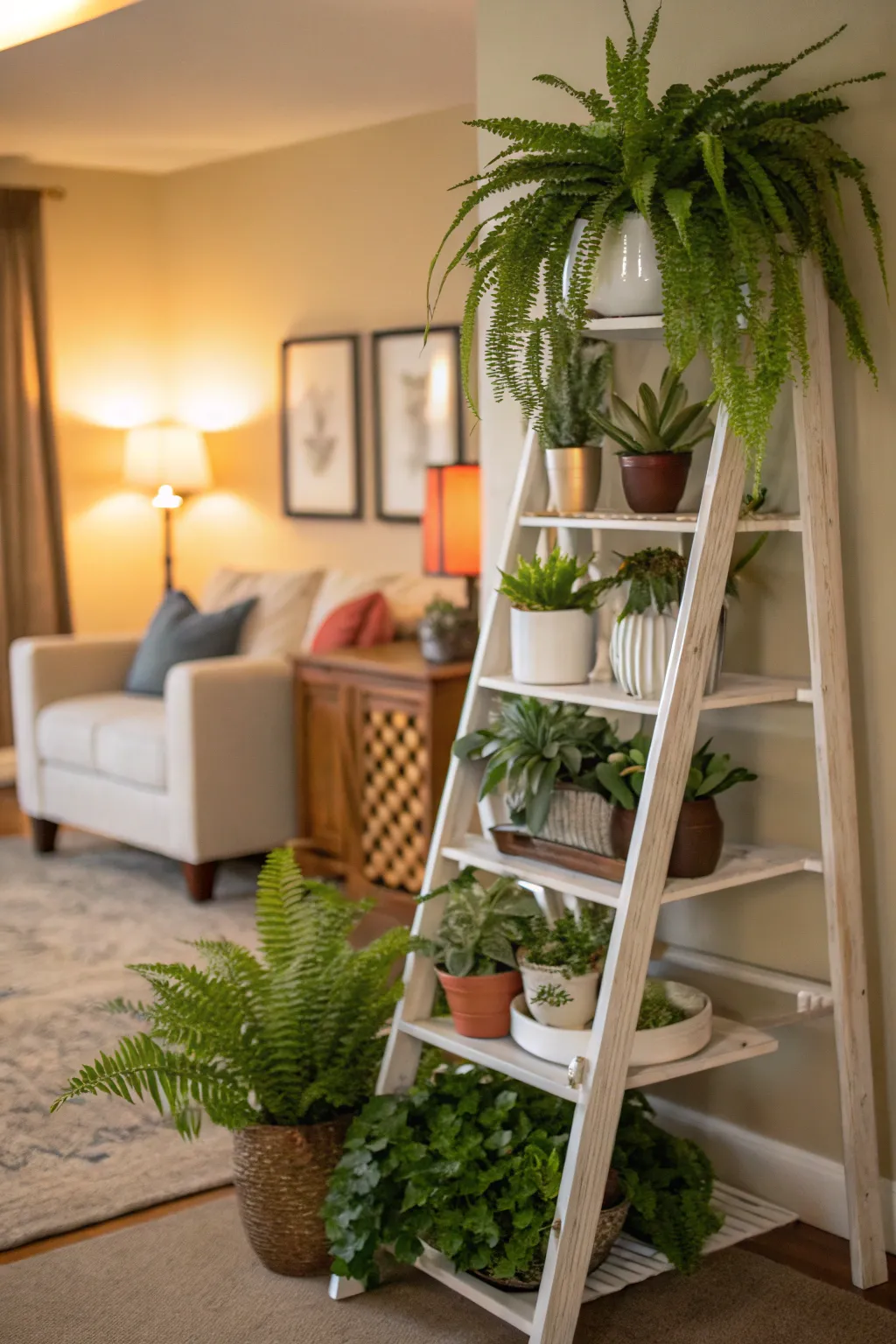 Ladder stands are great for showcasing multiple plants within a vertical design. I use one to show a mix of succulents and ferns, giving depth to my lounge area.