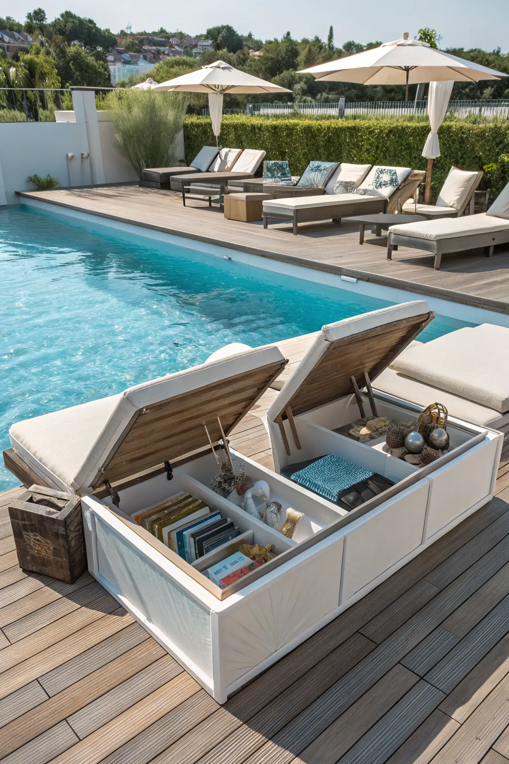 Opt for furniture including hidden storage to maintain a tidy deck. It’s my favored solution for stowing pool equipment while avoiding clutter.