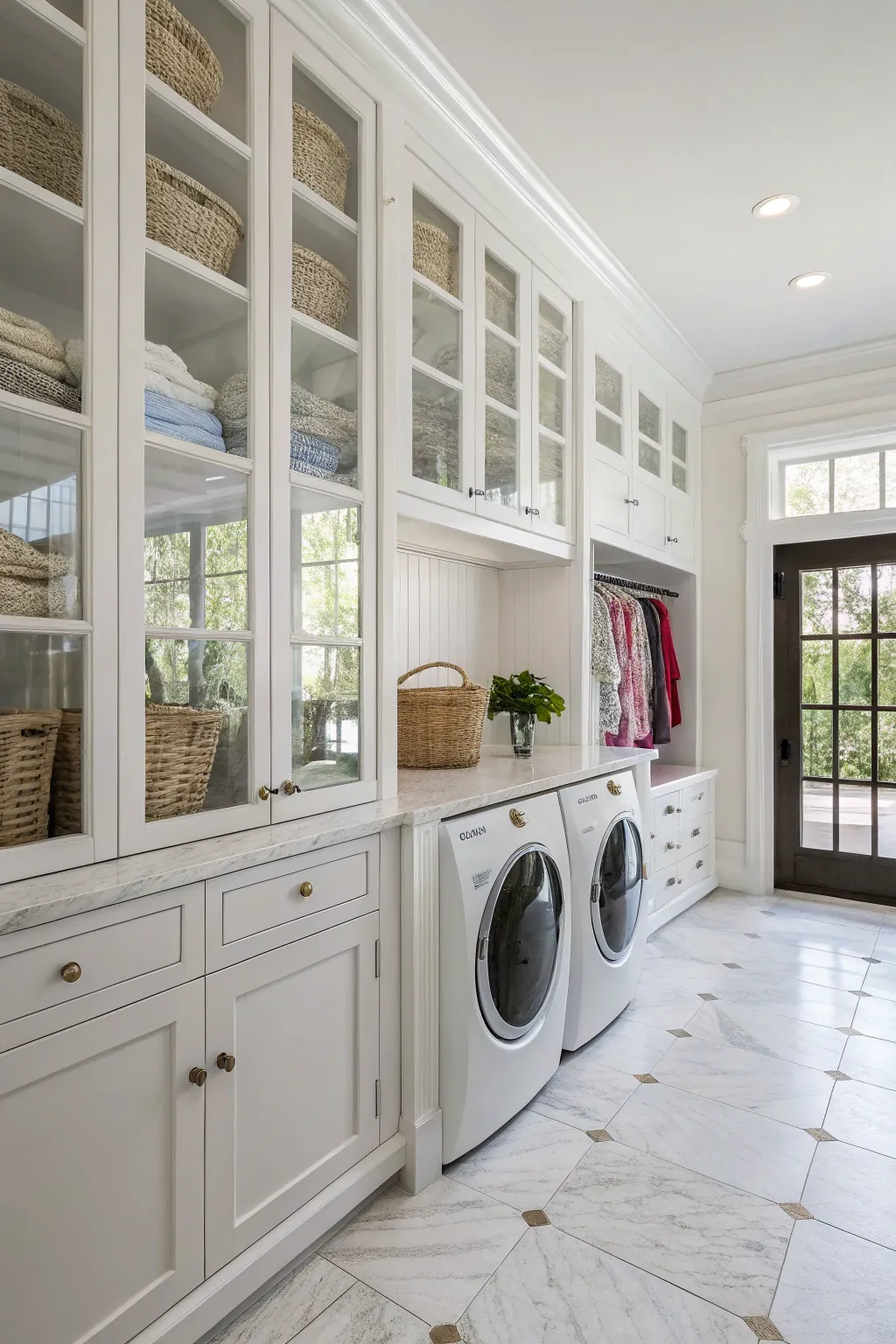 - Vitrine-Faced Kitchen Cabinets: Elevate your laundry room through these refined vitrine-front cabinets for a modern, airy appearance.