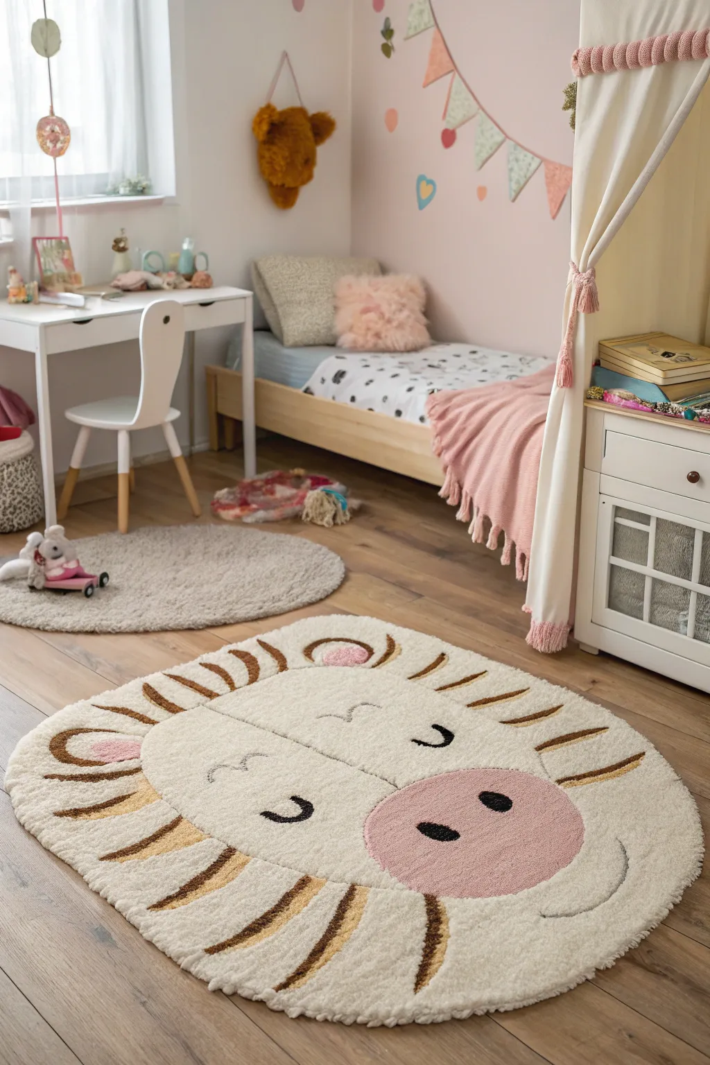 Animal-themed rugs introduce a whimsical aspect to kids' spaces.