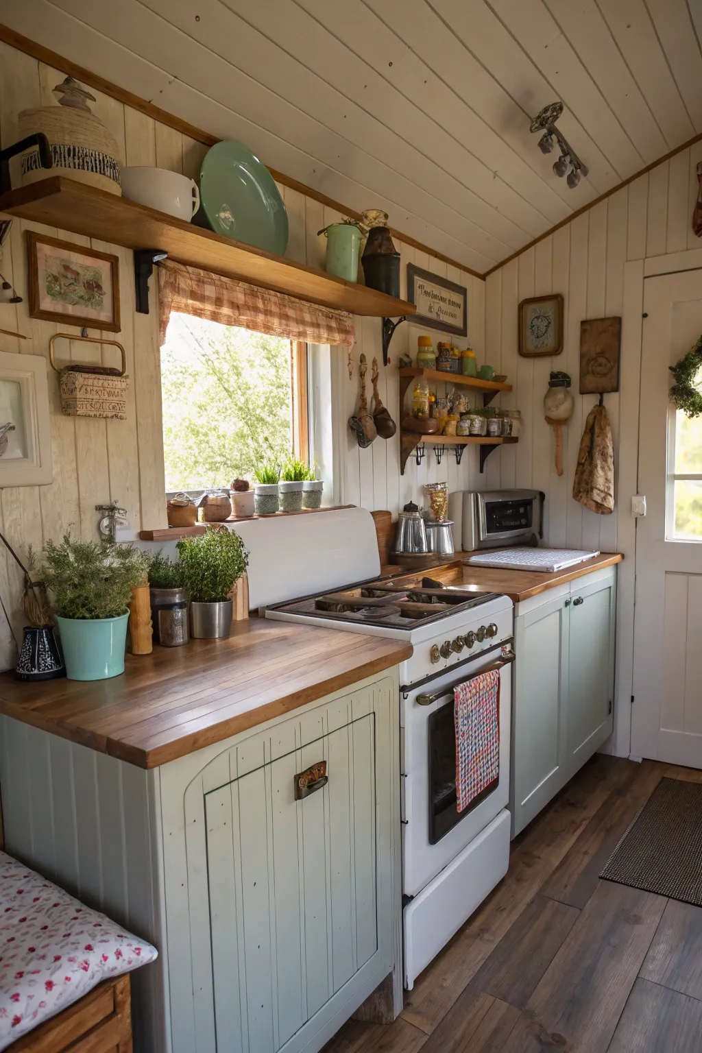 Craft a small kitchen with all crucial amenities, incorporating vintage elements for added character. In my ventures, these kitchens frequently evolve into the heart of the residence.