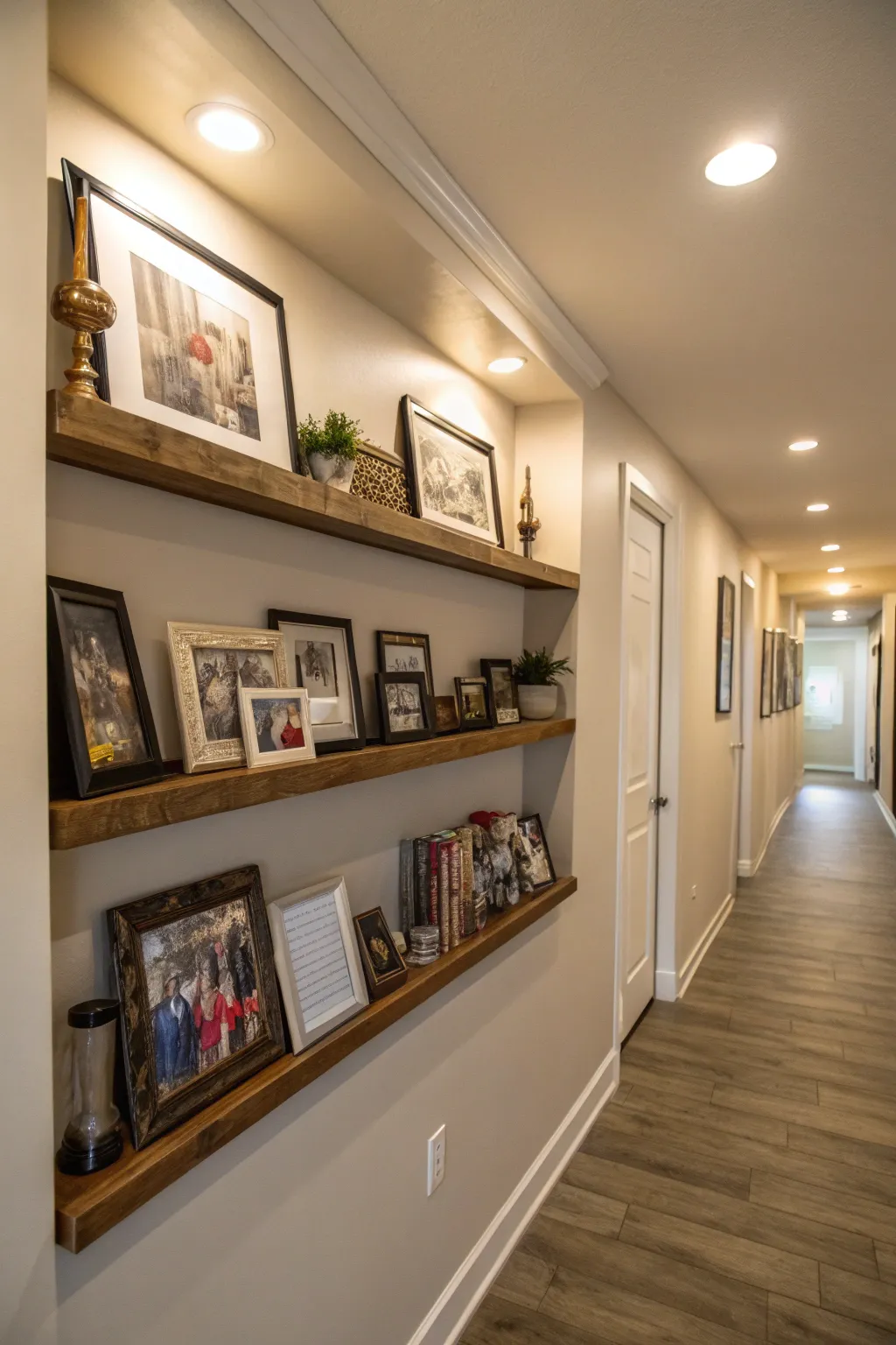 An art gallery with floating shelves may serve as a stunning point of interest. Grouping framed pictures with small artistic sculptures provides a lively, individualized display.