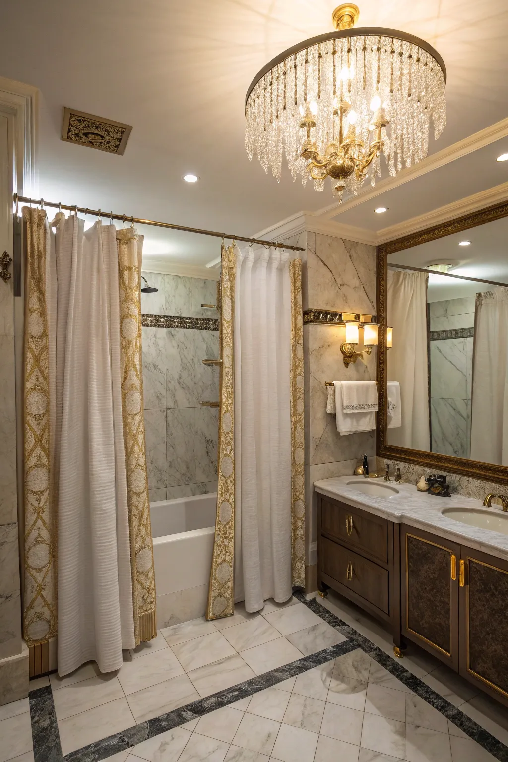 Employing lavish fabrics for double shower curtains can morph your bathroom into a serene, spa-like environment. I find that pairing these with a striking overhead light really amplifies that sophisticated feel.